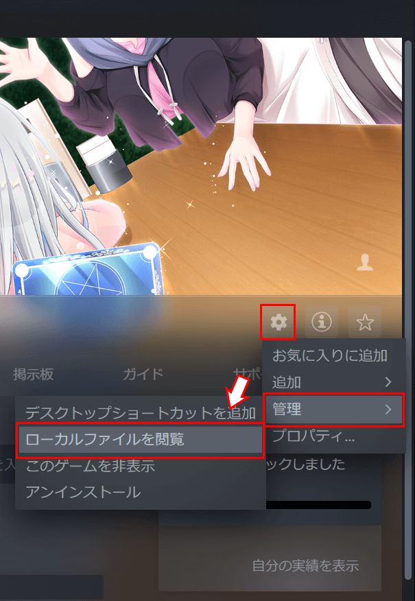 1. Steamアプリのライブラリから作品のページを開き、「ローカルファイルを閲覧」を選択します。
